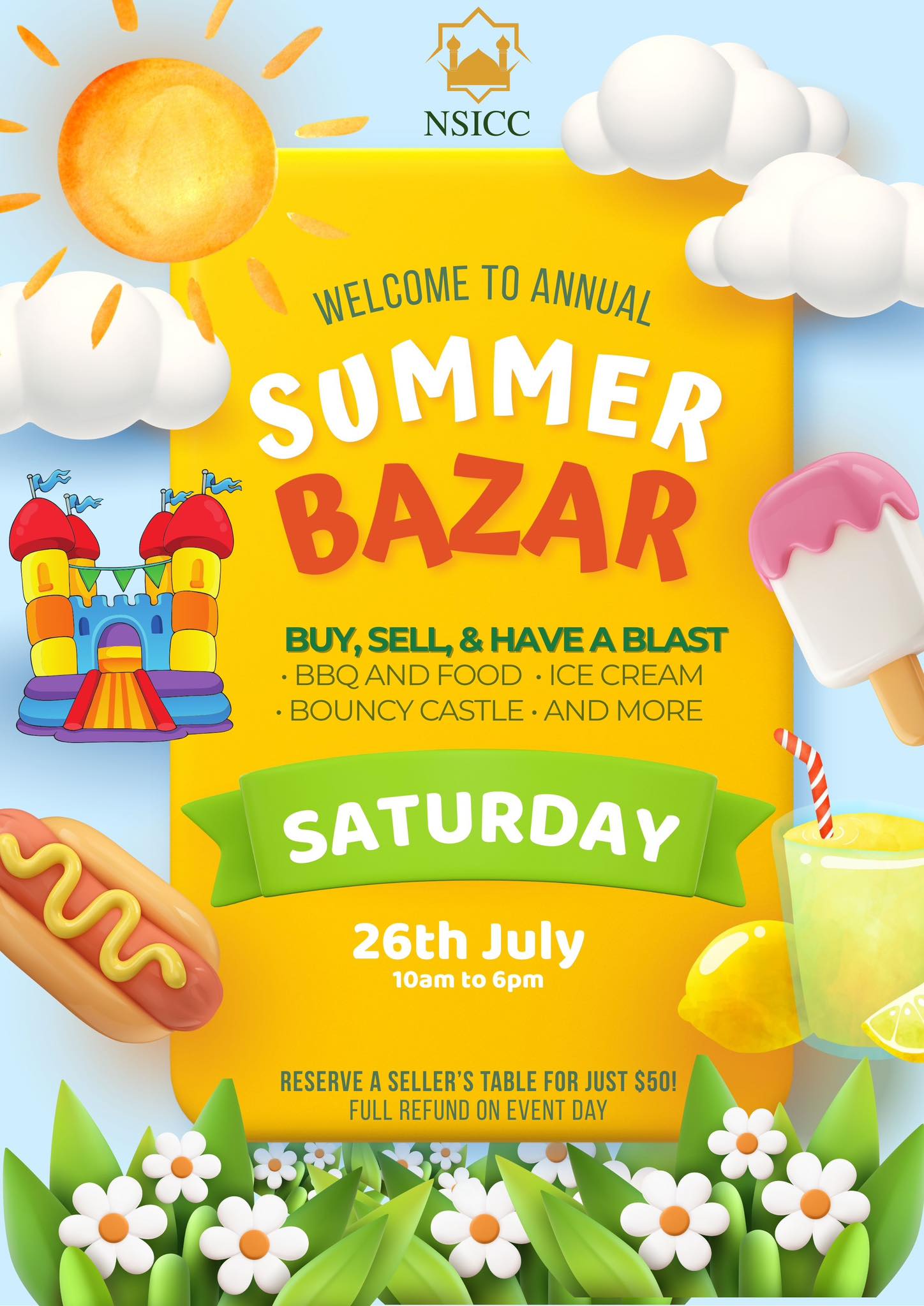 A vibrant Summer Bazaar at Kearney Lake Masjid, dedicated to supporting local individuals and small businesses. This is a great opportunity to showcase your products, connect with the community, and enjoy a day full of positive energy.