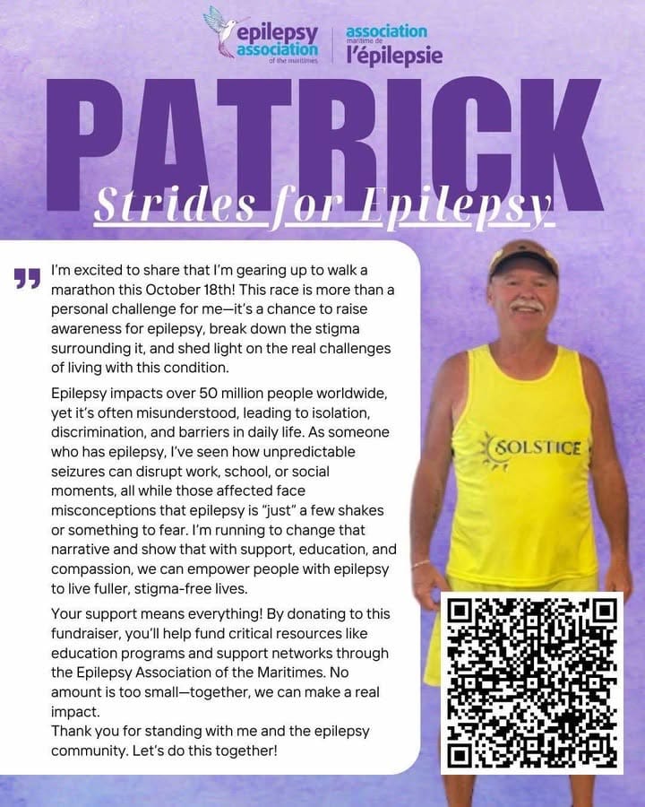 I’ll drop into to help Patrick kick off his marathon walk fundraiser on behalf of the Epilepsy Association of the Maritimes.